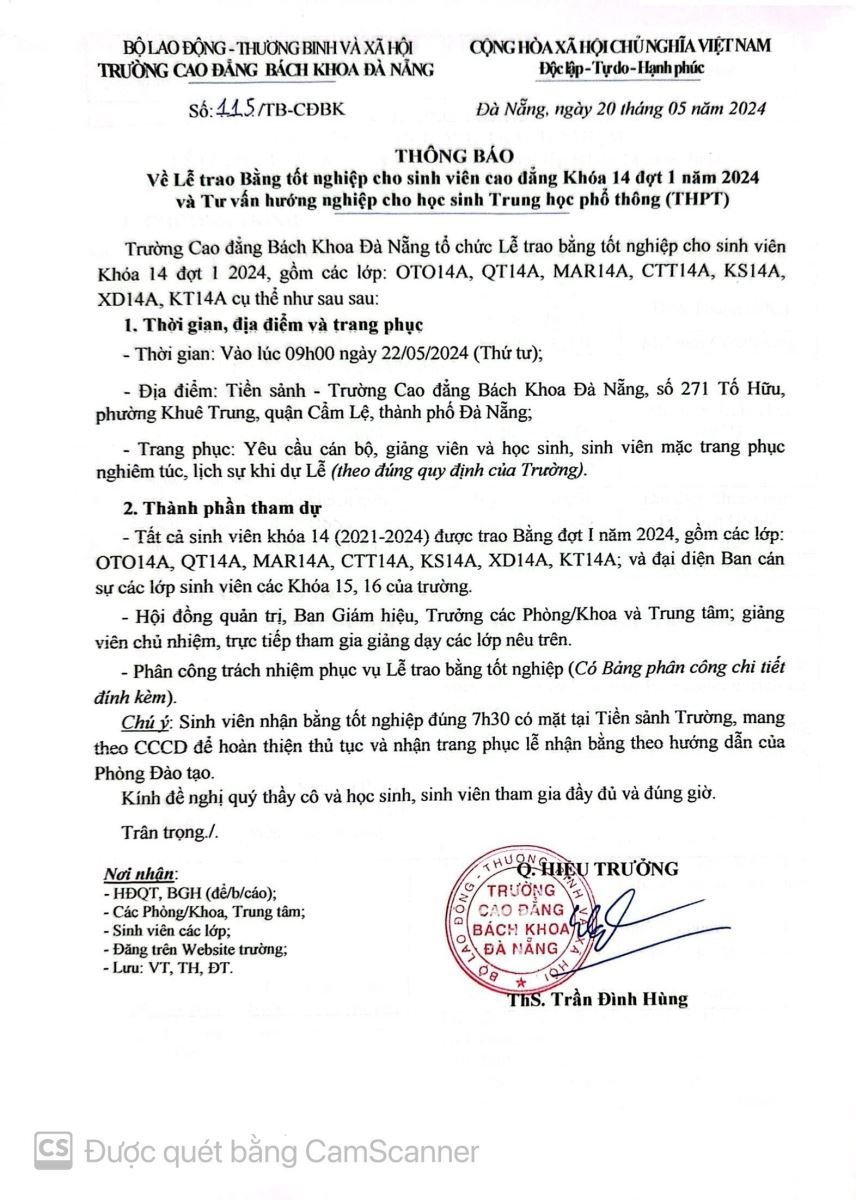 Thông báo kế hoạch Lễ trao bằng tốt nghiệp cho sinh viên cao đẳng khoá 14 (2021-2024) được tổ chức vào ngày 22/5/2024